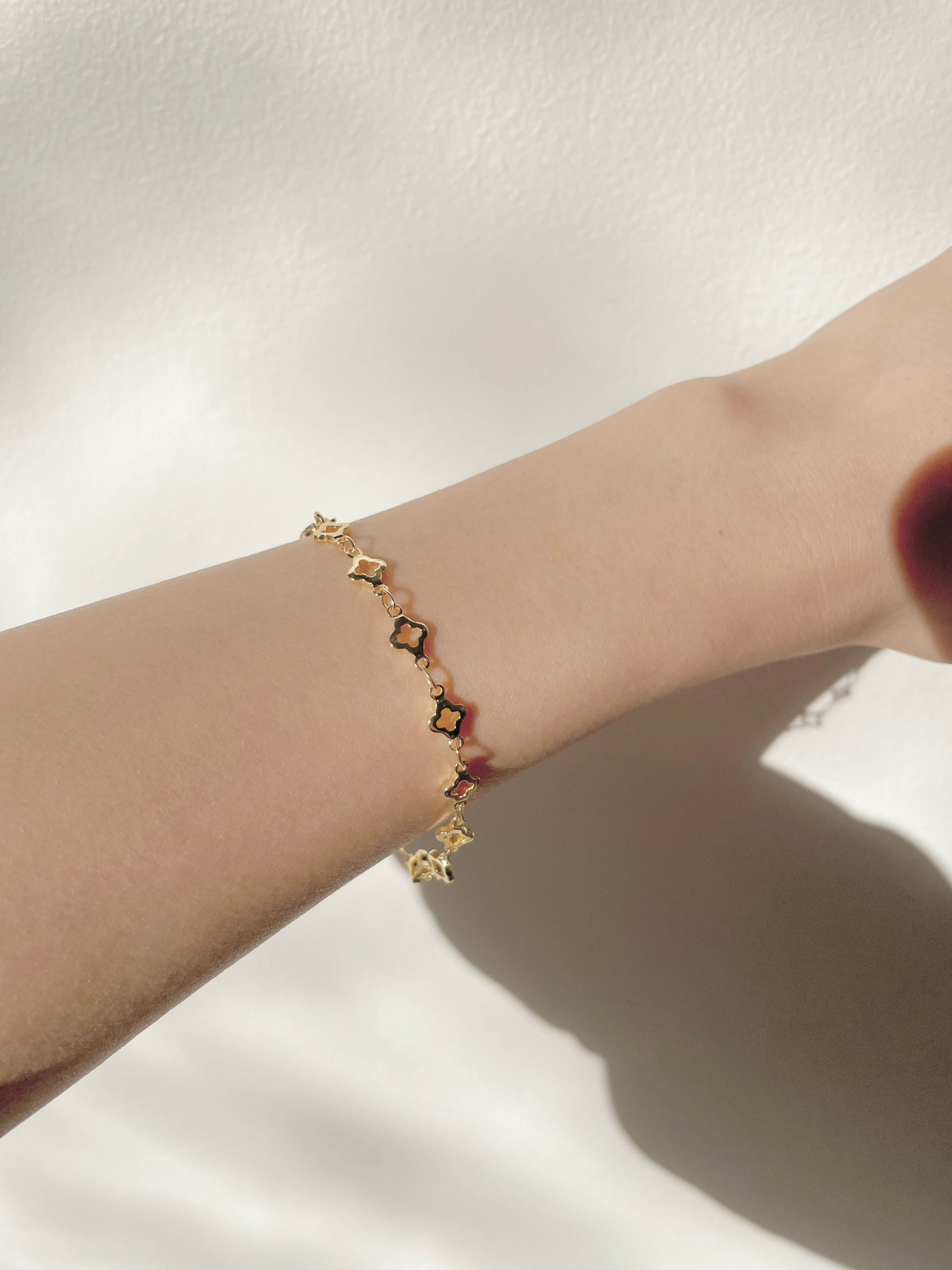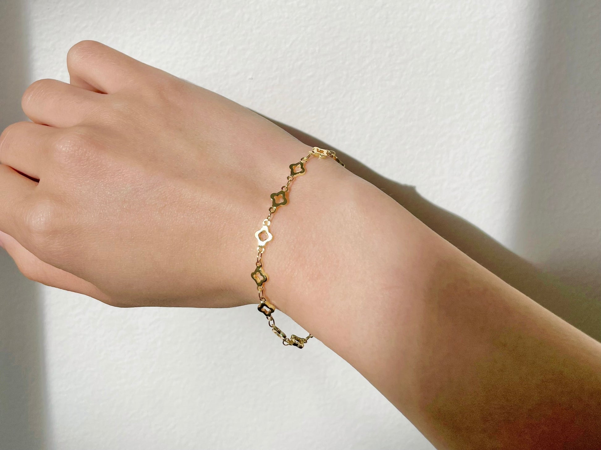 Elevate your style with our 14K Gold Filled Clover Bracelet. Featuring a delicate clover charm, this bracelet is waterproof, hypoallergenic, and tarnish-resistant, combining elegance with practical durability.