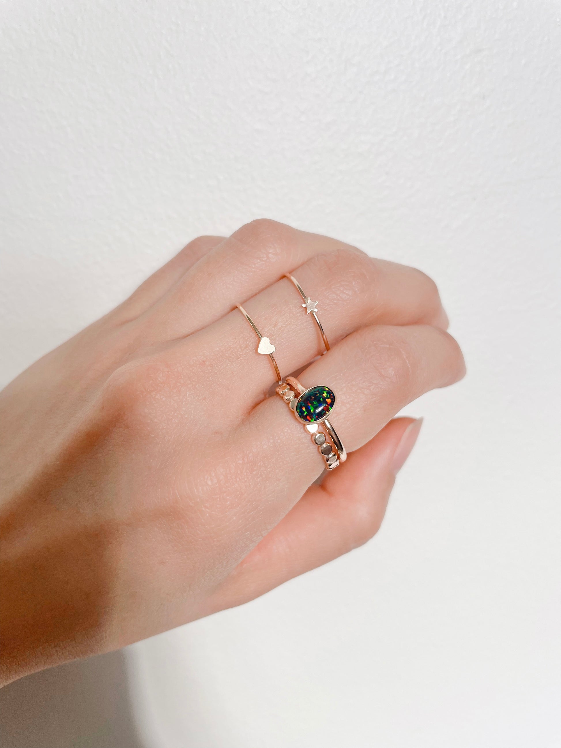 This dainty 14K gold-filled oval shape black opal ring is waterproof, tarnish-resistant, and perfect for everyday luxury.