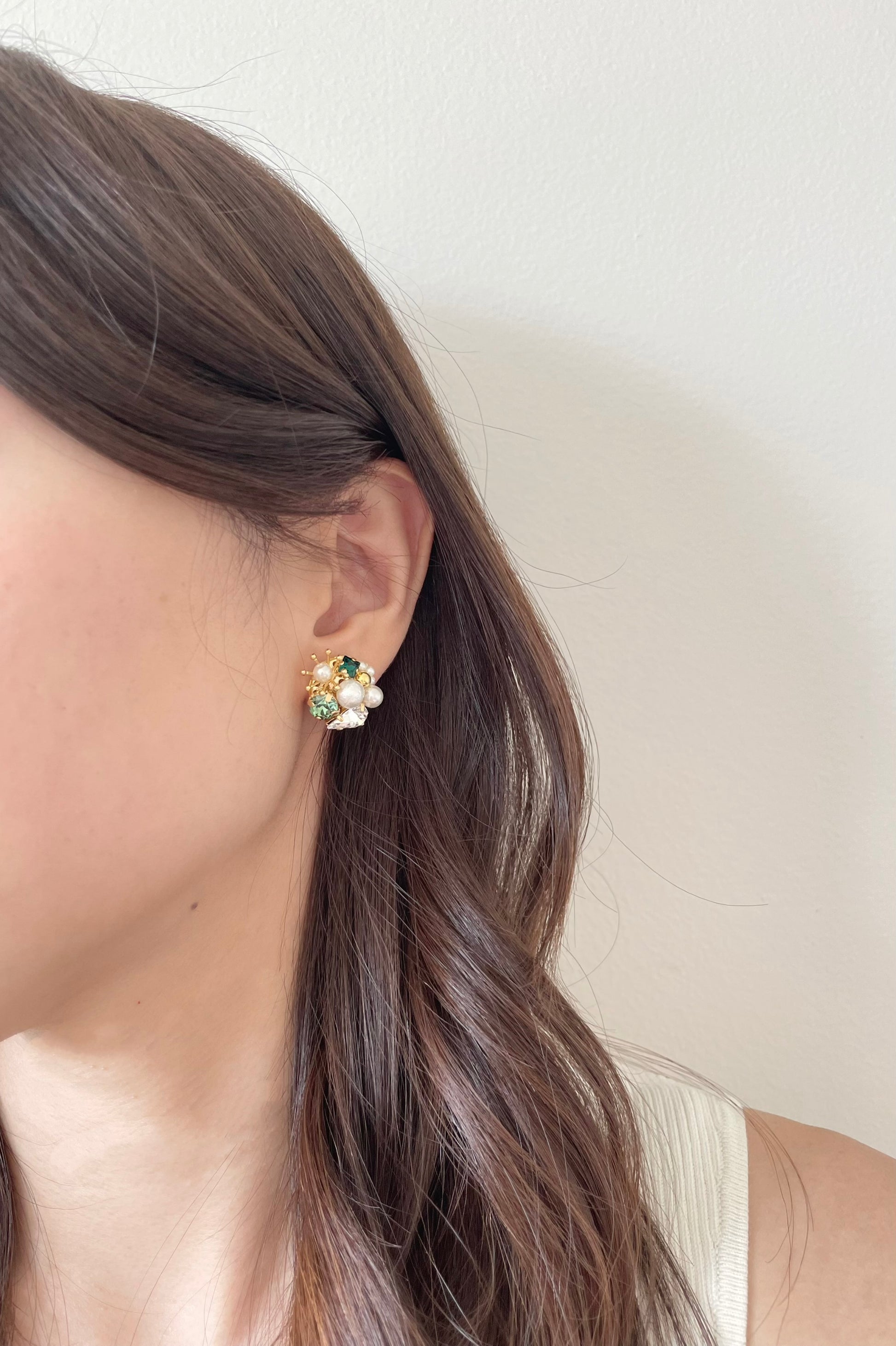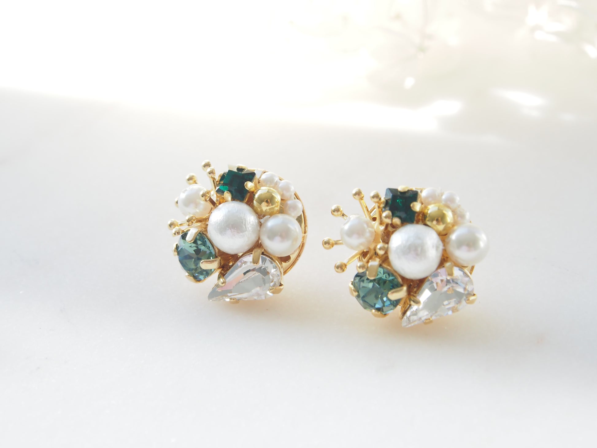 These earrings feature emerald and crystal-colored Swarovski with cotton pearls and antique parts suspended by delicate gold-plated earring parts.