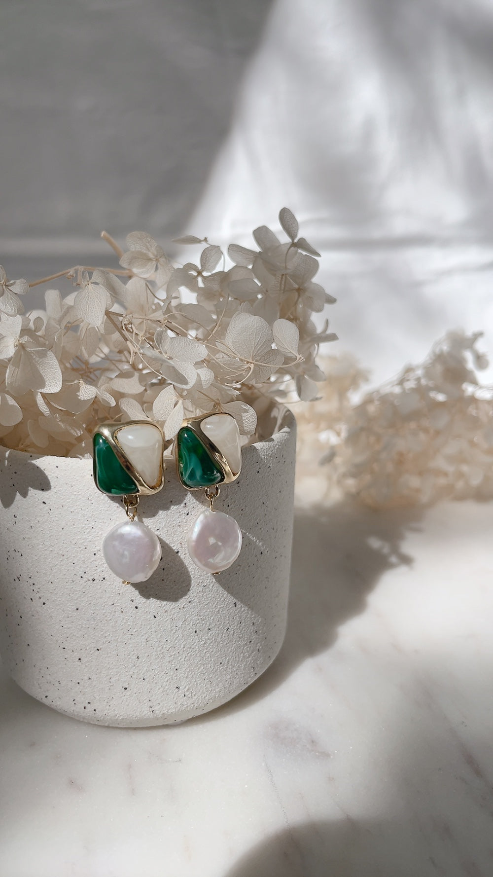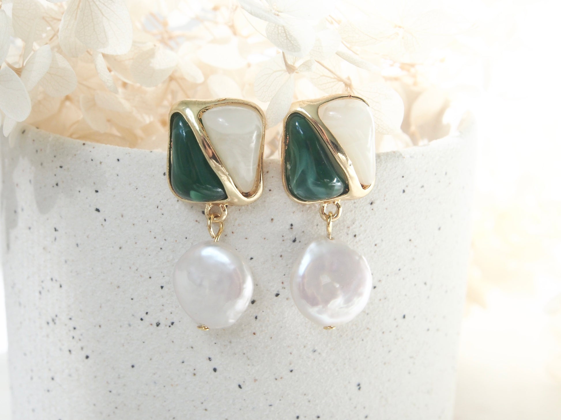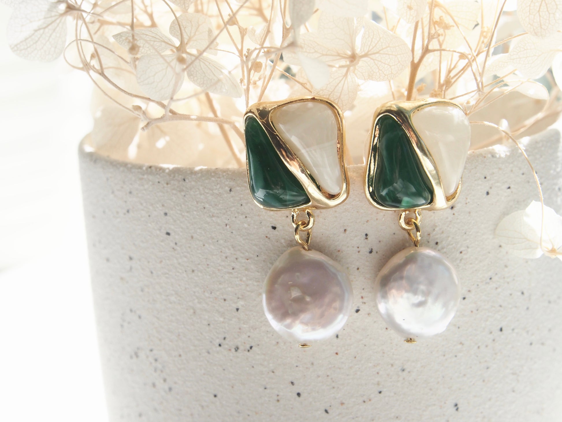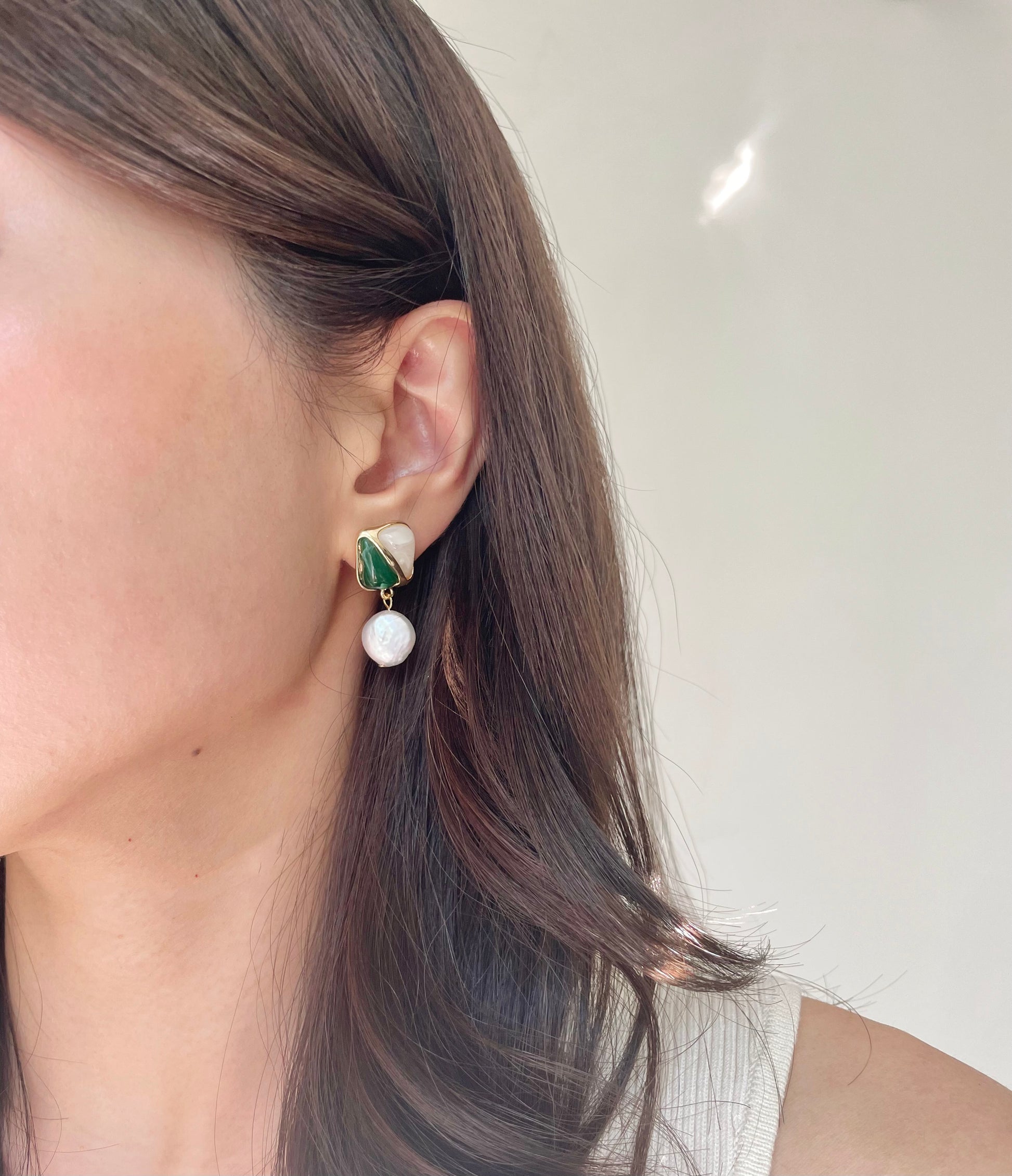 Elevate your style with these stunning green earrings adorned with high-quality freshwater pearls.