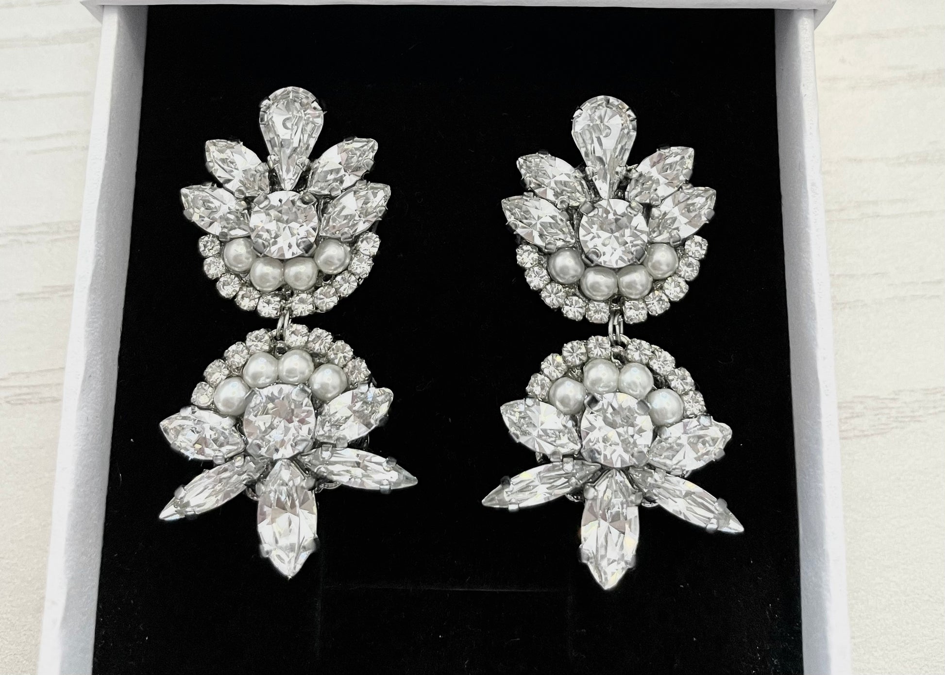 Full of Swarovski sparkles, these stunning earrings are perfect for your wedding day. Featuring dazzling Swarovski crystals and pearls, they are elegantly suspended from delicate silver-plated components.