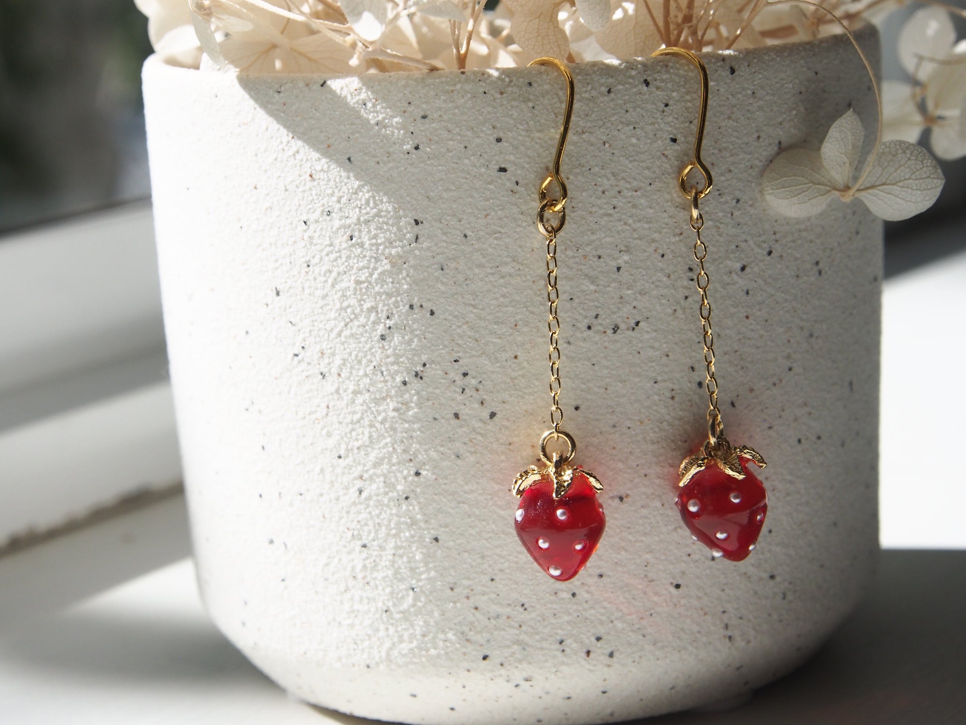 Wear a little bit of sweetness with these dainty strawberry earrings. These delicate strawberry earrings are a playful and whimsical accessory for any occasion.